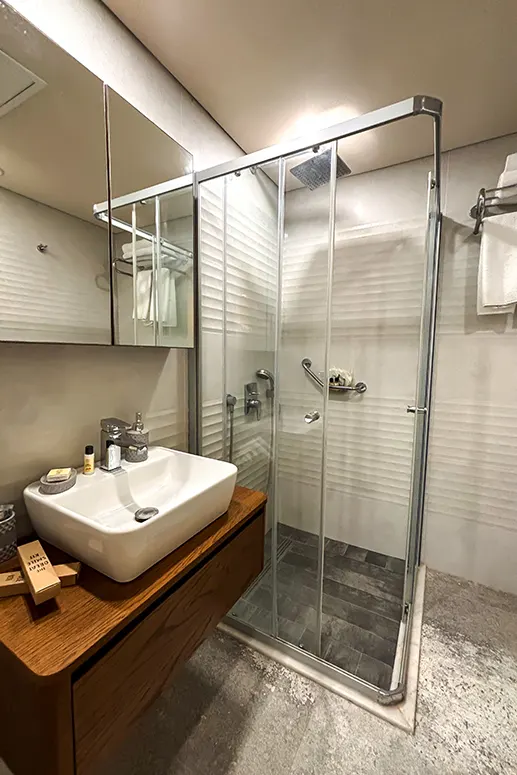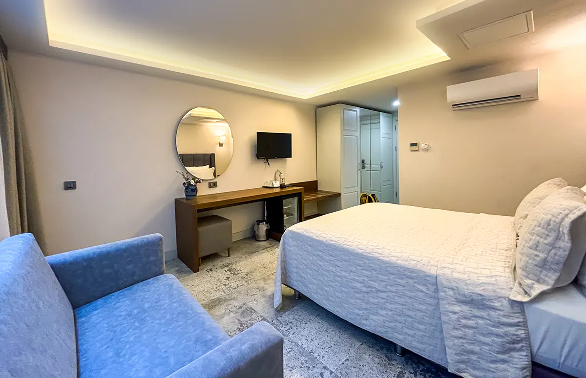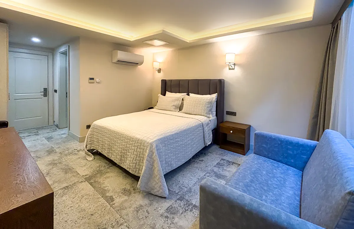Konforlu, şık, büyük ve ferah (zemin altıı, tavandan 2 m² penceresi olan) odalarımız estetik detaylarla misafirlerini ağırlıyor.